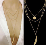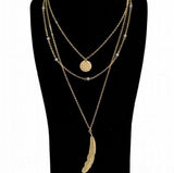 Gold Silver Beaded Metal Feather Pendant Multi Layer Chain Necklace